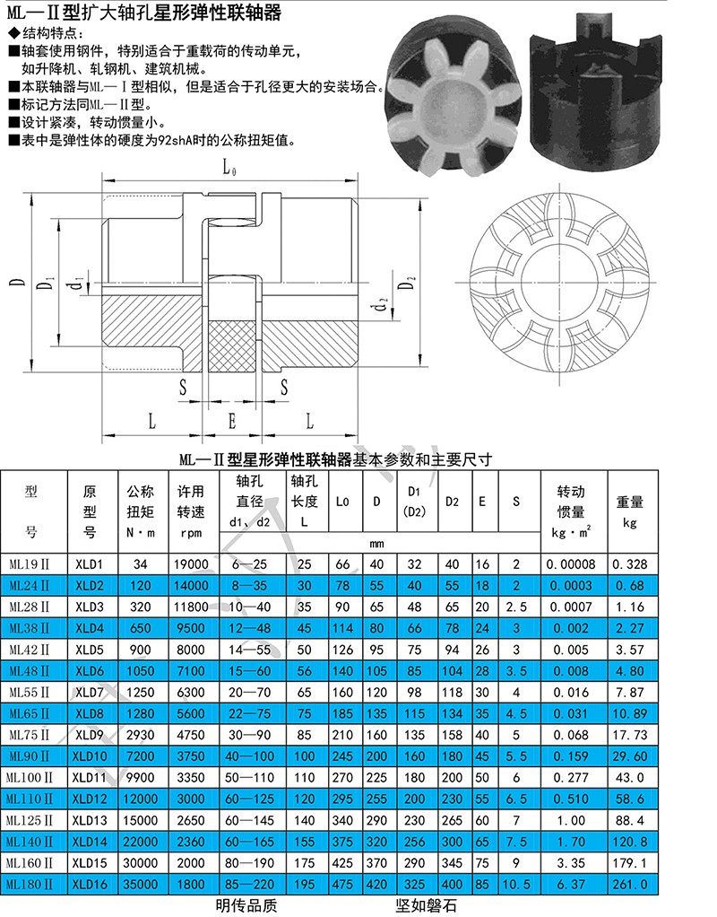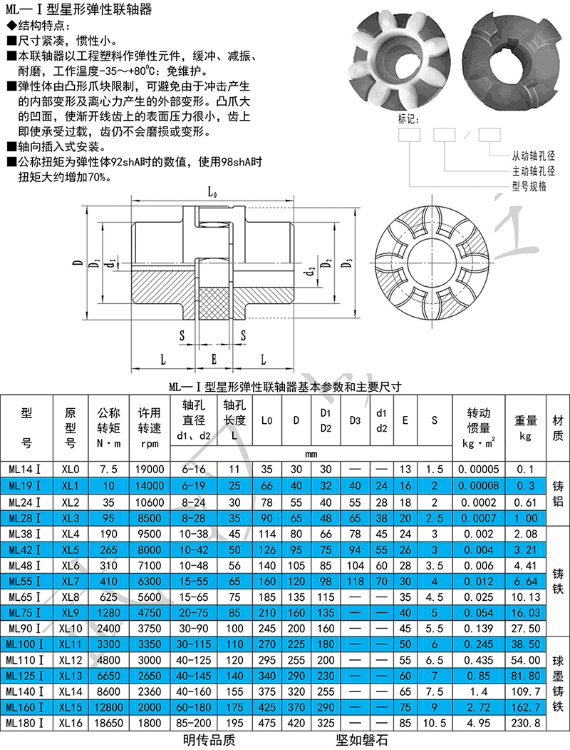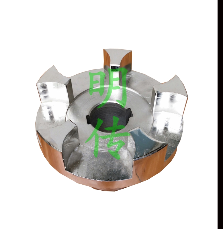 星形彈性聯軸器是由兩個帶凸爪形狀相同的半聯軸器和彈性元件組成,利用星形彈性元件置于兩半聯軸器凸爪之間,以實現兩半聯軸器的聯接。該聯軸器的結構與梅花形彈性聯軸器基本相同,區別在于彈性元件的形狀分別是星形和梅花形,性能和梅花形彈性聯軸器相同,具有一定補償兩周相對偏移、減振、緩沖性能,徑向尺寸小、結構簡單、不用潤滑承、載能力高,維護方便等特點。適于聯接兩同軸線,起動頻繁,正反轉多變的傳動軸系,傳遞轉矩20~25000N·m,工作環境溫度-35~80℃。